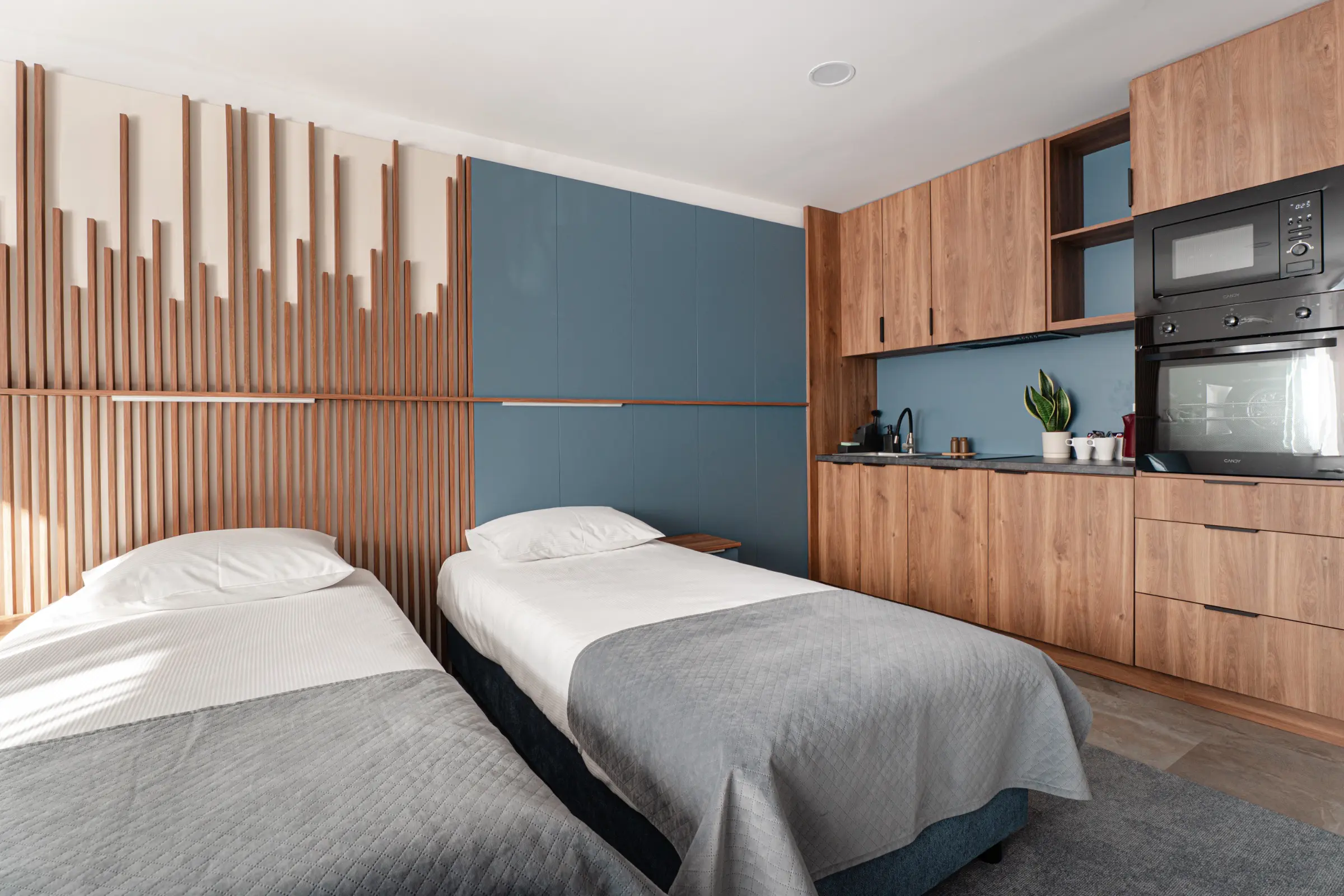 - W pełni wyposażona kuchnia (lodówka jw, piekarnik , mikrofala , zmywarka , płyta 2 palnikowa)